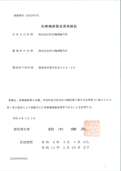 医療機器製造業 取得 登録番号:22BZ200102 初回登録:2016年2月29日 |